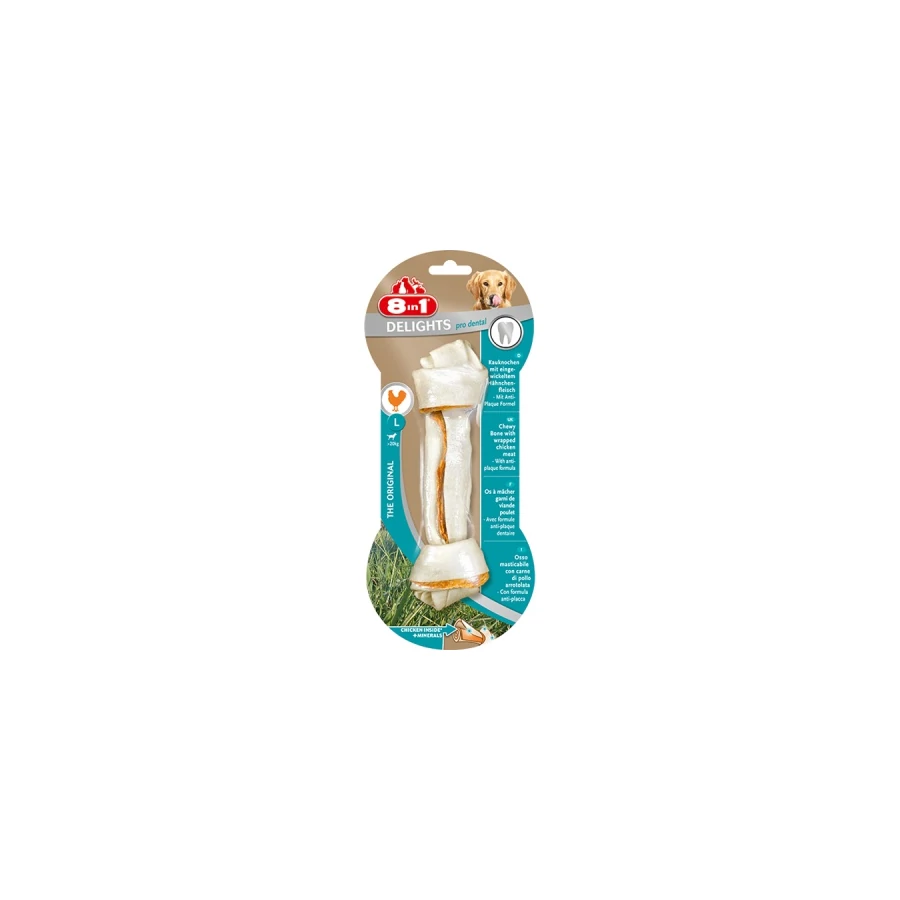 A hagyományos rágócsontoktól eltérően a hajtogatás szélein látszódó hússzeletek, és a hús illata arra ösztönzi a kutyát, hogy teljesen végigrágja a csontot, hiszen így fér hozzá az utolsó húsfalathoz, miközben hosszasan lefoglalja magát, és nem hagy maradékot. Továbbá az ásványi anyagok speciális keveréke szinte fogkrémként működik, fehérebb fogakat és kellemesen friss leheletet biztosítva. Köszönhetően annak, hogy az 8in1 Delights a rágócsont és a jutalomfalat szabadalmaztatott kombinációja, Ön a kutyáját nemcsak vidámabbá és fittebbé teheti, hanem a fogazatának és az ínyének az egészségéről is gondoskodhat.