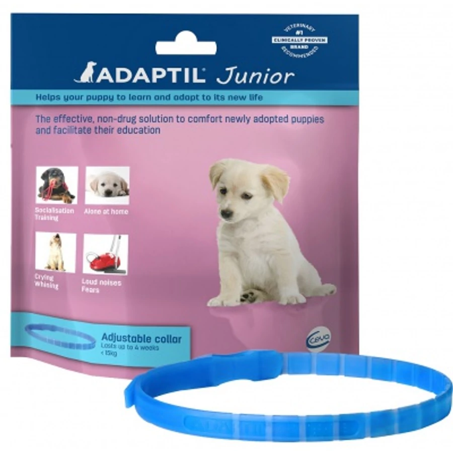 - Az ADAPTIL Junior Nyakörv “nyugtató üzenetet” küld a kiskutyának, hogy ugyanolyan jól és biztonságban érezze magát emberi családjában, mint annak idején a kutyamamával, továbbá, hogy felnőve kiegyensúlyozott és jól nevelt kutyává válhasson. Az ADAPTIL Junior használatával a kölyök családtagnak érzi magát.