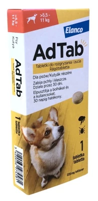 Az AdTab™ egy kicsi, hús ízű rágótabletta kutyák részére, ami gyorsan hat bolhák és kullancsok ellen. Biztonságos, hatékony és már két órán belül elkezd hatni. Az AdTab™ folyamatosan hat egy egész hónapon keresztül, és mivel a vizsgálataink során a kutyák 100%-a szerette (100%-ban megették), biztos lehet abban, hogy kedvence mindig megkapja a szükséges védelmet.