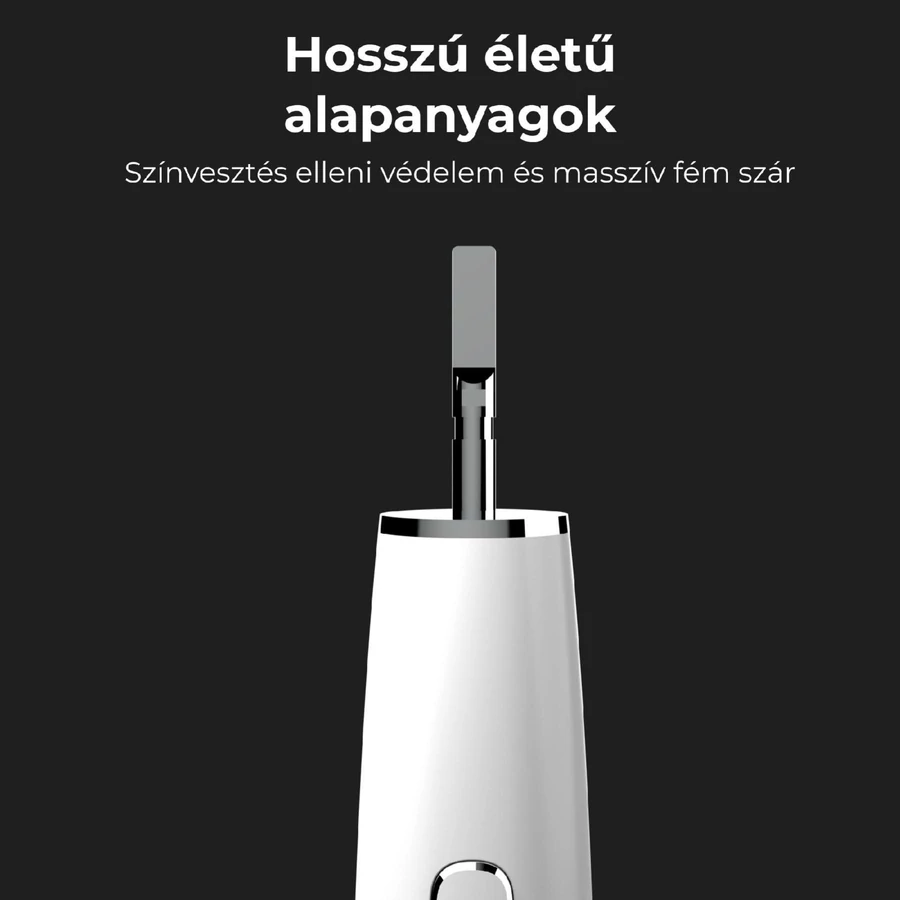 Hogyan teheti hatékonyabbá és tudatosabbá a napi szájápolást egy intelligens fogkefével? Az AENO ADB0001S DB1S szónikus fogkefe nem csupán a tökéletes tisztaságot biztosítja, hanem egy teljesen új élményt nyújt a fogmosásban: okos funkcióival, személyre szabható beállításaival és hosszú üzemidejével ideális választás mindazoknak, akik a modern technológiát a szájhigiénia szolgálatába szeretnék állítani. Szónikus technológia az alapos tisztításért A készülék percenként akár 46 000 vibrációt végez, így tízszer hatékonyabban távolítja el a lepedéket és ételmaradványokat, mint egy manuális fogkefe anélkül, hogy irritálná az ínyt vagy károsítaná a fogzománcot. A DuPont, közepes keménységű sörték kíméletesen tisztítanak, miközben maximális hatást biztosítanak. Sokoldalú, elegáns funkciók A fogkefén négy beépített üzemmód – Soft, Clean, Massage és White – érhető el közvetlenül, míg az AENO alkalmazáson keresztül további nyolc intelligens beállítás (ínyápolás, express tisztítás, mélytisztítás, fogszabályzóhoz optimalizált mód, mélyfehérítés stb.) aktiválható. Ezen felül három különálló felhasználói profil kezelhető ugyanazon eszközön belül, így több személy is használhatja saját beállításaival. Fogmosási pozíció emlékeztető & trendkövetés A fogkefe folyamatosan figyelmeztet, ha fogmosás közben egy területet elhanyagolna – segítve az egyenletes tisztítást. A töltöttségi szint folyamatosan követhető az applikációban, ami elősegíti a rendszeres használatot és megelőzi a lemerülést is. Hosszú üzemidő és megbízhatóság A 1400 mAh kapacitású lítium-ion akkumulátor akár 90 napos folyamatos működést tesz lehetővé egyetlen töltéssel. A töltési idő 5,5 óra, így tökéletes útitárs is, hiszen nem szükséges gyakran újratölteni. Vízállóság és praktikus töltőállomás A fogkefe IPX7 vízálló, így biztonsággal használható zuhany vagy kézmosás közben is. A töltőállomás IPX5 védelmet kapott, könnyen tisztítható és diszkréten tartja a készüléket. Technikai részletek egy helyen - Maximális sebesség: 46 000 rezgés/perc, zajszint ≤ 60 dB - Mérete (fogkefével): 25,8 × 240 mm, súlya: 105 g; csomag súlya: 170 g - Energiaellátás: nem cserélhető akkumulátor, USB (A/C) kábeles töltés (0,8 m), töltő: 5 V DC / 1 A bemenet, 5 V / 0,3 A kimenet - Anyagok: fogkefe teste ABS műanyag, töltőállomás ABS; sörték: DuPont nylon, közepes keménység; szín: fehér - Komplett csomag: fogkefe, 3 cserélhető fej külön jelöléssel, vezeték nélküli töltőállomás, USB kábel, gyors üzembe helyezési útmutató; adapter nem tartozék - Garancia: 2 év; tanúsítványok: CE, UKCA, RoHS, EAC, UA.TR; megfelel a vonatkozó EU szabványoknak Miért érdemes az AENO ADB0001S DB1S fogkefét választani? - Akár 46 000 rezgés / perc – mély, mégis kíméletes tisztítás - 12 működési mód – 4 natív beállítás és 8 intelligens üzemmód az alkalmazásban - 3 felhasználói profil és emlékeztetők – személyre szabott és teljes körű élmény - Akár 90 nap működés egyetlen töltéssel – hosszú távú megbízhatóság - IPX7 vízállóság fogkefe testen, IPX5 a töltőállomásnál - Nagy méretű, tiszta kijelzés, megbízható szerkezeti anyagok - Komplett csomag cserélhető fejekkel és töltőállomással - 2 év garancia, hitelesített biztonság Emelje új szintre a napi fogápolást – válassza az AENO ADB0001S DB1S intelligens szónikus fogkefét, és tapasztalja meg a professzionális, személyre szabott tisztaságot minden nap!