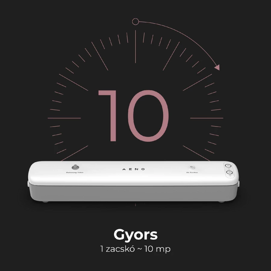Hogyan őrizhető meg hosszabb ideig az ételek frissessége, anélkül hogy a fagyasztó vagy a hűtő lenne túlzsúfolva? Az AENO VS1 vákuumcsomagoló kiváló választás mindazok számára, akik modern, hatékony és higiénikus megoldást keresnek az élelmiszerek hosszabb távú tárolására. A készülék 65 kPa szívóteljesítményével és 180 °C-os fűtési hőmérsékletével biztosítja, hogy a lezárás légmentes és tartós legyen, ezzel megőrizve a tápanyagokat, az ízeket és az ételek minőségét. Erőteljes vákuumozás gyors, automatikus működéssel Az AENO vákuumcsomagoló 30 másodperc alatt vákuumoz, majd mindössze 10 másodperc alatt lezárja a tasakot, így ideális megoldás akár napi használatra is. A 4,5 liter/perc teljesítmény gyors és hatékony működést garantál, miközben az egyérintéses automatikus funkció kényelmes és egyszerű használatot biztosít – nincs szükség bonyolult beállításokra. Rugalmasan használható, nagyobb adagokhoz is alkalmas A készülék akár 30 cm széles vákuumzacskókkal is kompatibilis, így kisebb és nagyobb élelmiszerek csomagolása egyaránt egyszerűen megoldható. A 2,5 mm-es hegesztett varrat gondoskodik a biztonságos és szivárgásmentes zárásról, míg a +180 °C fűtési hőmérséklet professzionális minőségű hegesztést biztosít. Kompakt méret, mégis sokoldalú felhasználás A vákuumcsomagoló mérete mindössze 380 × 68 × 54 mm, így kis helyen is elfér, könnyen tárolható és bárhová elhelyezhető a konyhában. A készülékhez tartozik 10 darab bordázott zacskó, valamint egy vákuumtartály-adapter, amely lehetővé teszi a külön vákuumtartályok csatlakoztatását is – ideális például levesek, mártások vagy előre elkészített ételek légmentes tárolására. Miért érdemes az AENO AVS0001 VS1 vákuumcsomagolót választani? - Erőteljes szívóteljesítmény (65 kPa) a tökéletes vákuumért - Gyors vákuumozás és lezárás – időtakarékos használat - Nagy, 30 cm-es tasakméret-kompatibilitás - Professzionális, 180 °C-os fűtés a szivárgásmentes hegesztéshez - Egyérintéses működés az egyszerű használatért - Kompakt méret, praktikus tartozékokkal - Tartályadapterrel bővíthető funkciók Tartsa frissen kedvenc ételeit hosszabb ideig, csökkentse a pazarlást és szervezze át konyhai tárolását egy intelligens, energiatakarékos megoldással! Válassza az AENO AVS0001 VS1 vákuumcsomagolót, és élvezze a modern tárolástechnológia kényelmét minden egyes nap!