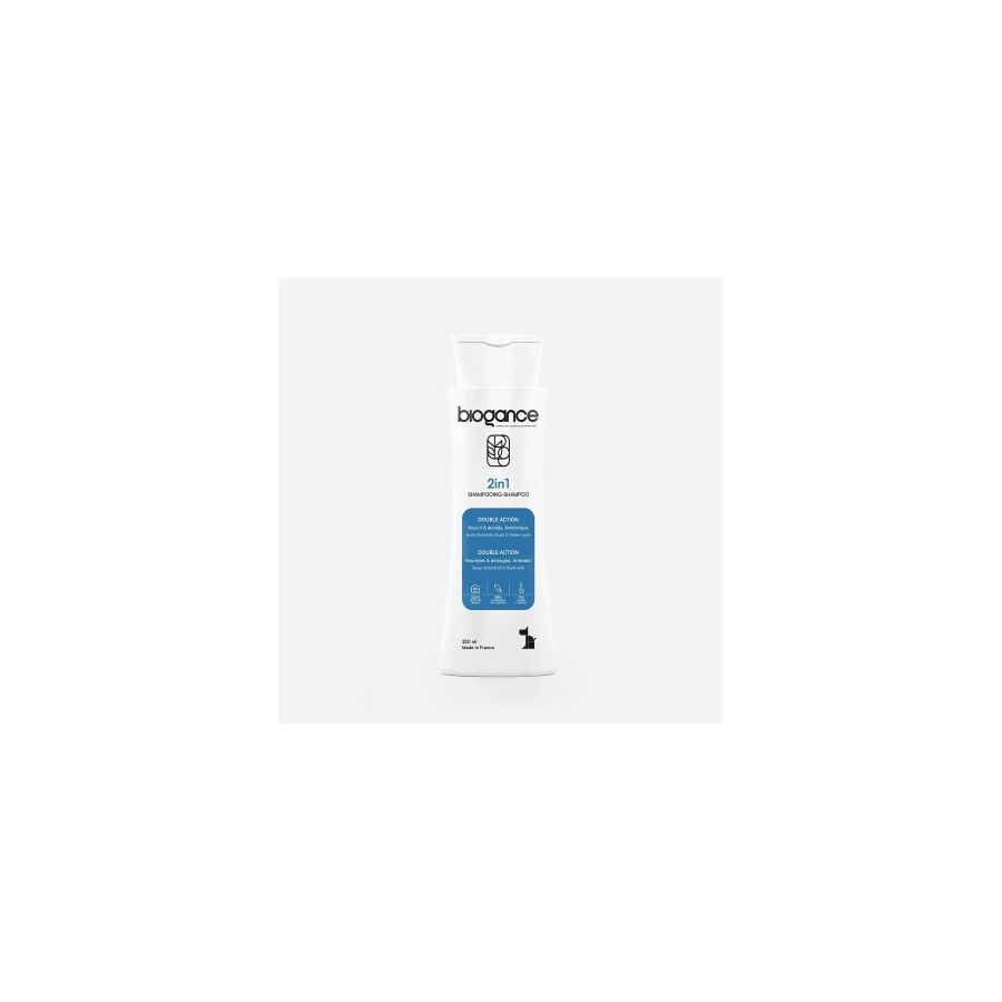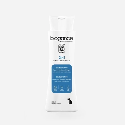 Biogance 2 in 1 Shampoo - sampon és balzsam egyben, kutyák részére.A 2 az 1-ben kondicionáló és antisztatikus sampon bioaktiv összetevőibel és speciális borágó és édesmandula kivonataival hármas hatással bír: tisztítja, táplálja és kisimítja a szőrzetet. Segít csökkenteni az allergia kockázatát.