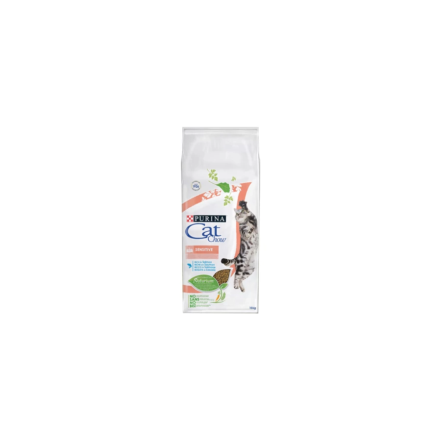 - A Cat Chow Adult Sensitive lazacban gazdag, és minden létfontosságú tápanyagot tartalmaz, amelyre macskájának szüksége van általános egészségének megőrzéséhez, így többek közt E vitamint a természetes védekezőképesség támogatásáért és B vitaminokat, amelyek segítenek macskája hatékonyabb energiafelhasználásában.