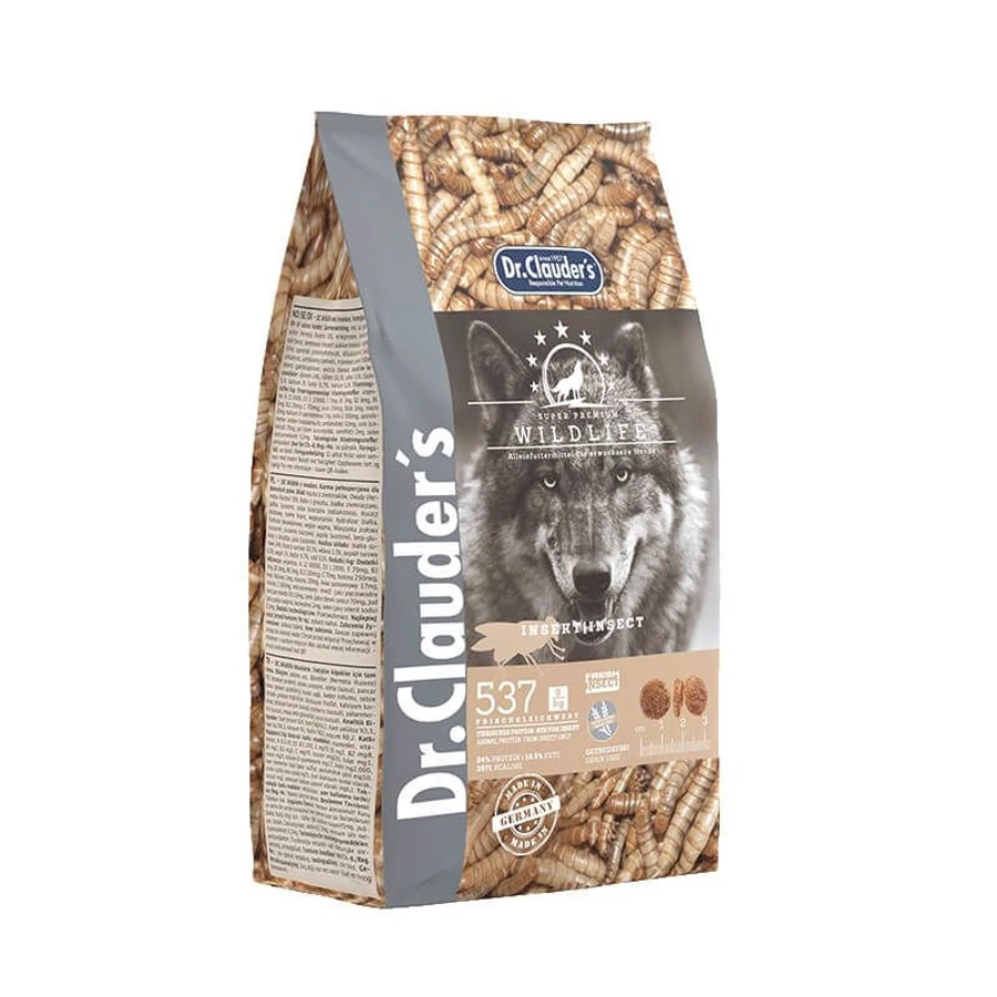 A Wildlife Insect egy magas fehérjetartalmú szárazeledel a kutya napi táplálkozásához. Eredetileg a kutya étrendje állati fehérjeforrásokból, valamint zöldségekből, gyümölcsökből és gyógynövényekből állt. A Dr. Clauder's Wildlife Insect egyesíti négylábú barátja igényeit rovarok, zöldségek, gyümölcsök és gyógynövények összetételével. A rovarok esetében alacsony az intolerancia kialakulásának lehetősége, ezért ideális innovatív és fenntartható megoldást jelentenek a táplálkozási szempontból érzékeny állatok számára. Teljes aminosavprofillal rendelkeznek. Fehérjetartalma a marhahúséhoz hasonló. A rovarok biotinban és magnéziumban gazdagok. Egyetlen fehérje - gabonamentes - kiegyensúlyozott fehérje-energia arány - tartósítószer nélkül. Teljes értékű eledel felnőtt kutyák részére. Összetétel: burgonyaliszt, rovarok (Hermetia illucens) 30%, borsófehérje, burgonya fehérje, alma (dehidratált), cukorrépapép (cukormentes), baromfi zsír, lenmag, vegetáriánus fehérje hidrolizátum, dikalcium, kalcium-karbonát, gyógynövénykeverék (dehidratált), áfonya (dehidratált), kék áfonya (dehidratált), élesztő béta glükán, yukka (dehidratált). Analitikai összetevők: nyersfehérje 24%, nyerszsír 10,5%, nyersrost 3,5%, nyershamu 6,3%, kalcium 1%, foszfor 0,7%, nátrium 0,2%. Adalékanyagok/kg: tápértékkel rendelkező adalékanyagok: vitamin: A 12 000NE, D3 1 200NE, E 70mg, B1 3mg, B2 8mg, B6 2mg, B12 20µg, C 70mg, biotin 250µg, folát 1mg, niacin 20mg, kalcium-D-pantotenát 17mg, kolin 2 000mg, nyomelemek: réz (réz-szulfát pentahidrát) 10mg, cink (cink-oxid) 70mg, jód (vízmentes kalcium-jodát formájában) 2mg, szelén (nátrium-szelenit) 0,2mg. Technológiai adalékanyagok: antioxidáns.