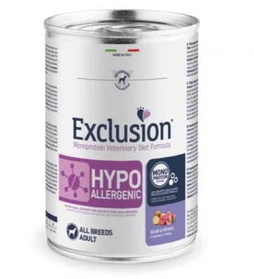 Teljes értékű diétás, egyfehérjés állateledel vaddisznó és burgonya felhasználásával tápanyag intollerancia csökkentésére felnőtt kutyák számára