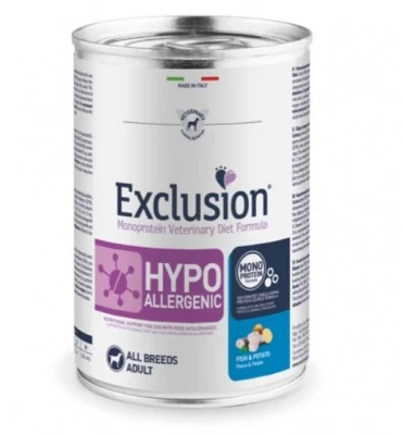 Teljes értékű, hipoallergén, diétás, egyfehérjés állateledel hal és burgonya felhasználásával táplálék-intoleranciával küzdő felnőtt kutyák számára