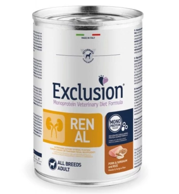 Teljes értékű diétás, egyfehérjés állateledel sertés, cirok és rizs felhasználásával veseelégtelenséggel küzdő kutyák számára
