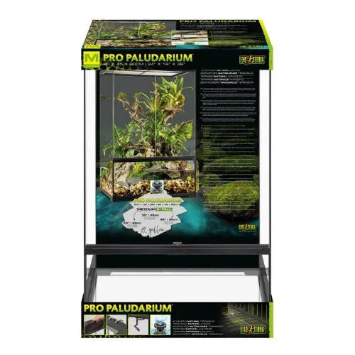 Az Exo Terra PRO Paludarium 60x45x90cm egy gyönyörűen kialakított félig vízi terrárium, amelyet az élénk esőerdő, mocsár vagy patak környezetének imitálására terveztek, dinamikus élőhelyet kínálva mind a vízi, mind a szárazföldi fajok számára. Az európai herpetológusok által tervezett extra magas üvegkamra extra mély, vízálló alappal és magas elülső üvegpanellel rendelkezik, amely lehetővé teszi a vízmennyiség növelését és a változatos mikroélőhelyek létrehozását. Az integrált alsó vízelvezető rendszer leegyszerűsíti a vízcserét és a karbantartást. Az akvárium szabadalmaztatott kettős szellőztetőrendszerrel rendelkezik, amely segít minimalizálni a páralecsapódást, biztosítva a tiszta kilátást és az optimális feltételeket a hüllők, kétéltűek és növények számára.