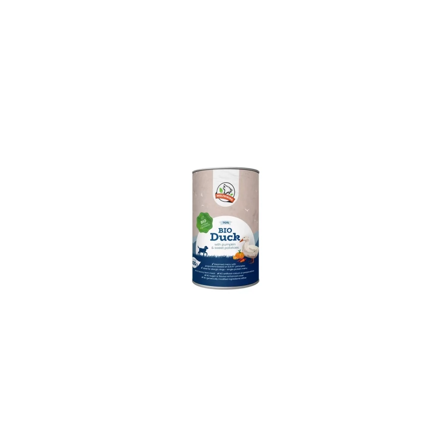 Összetevők: 69,45 % bio kacsa (kacsamell, szív, nyak, máj, csontos részek), 19 % bio sütőtök, 10 % bio édesburgonya, 0,5 % bio lenmagolaj, 0,05 % bio Ascophyllum nodosum (barna alga). Analitikai összetevők: nyersfehérje 7,67 %, nyersolajok és zsírok 6,06 %, nyershamu 2,18 %, nyersrost 0,82 %, nedvességtartalom: 78,78 %, kcal: 100,74 kcal/100 g.