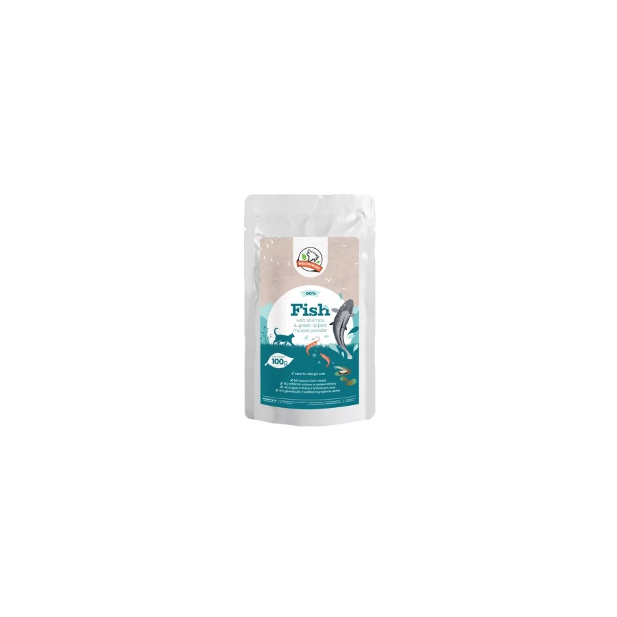 90% hal, 5% garnélarák, 1,5% bio kókuszpehely, 1% új-zélandi zöldkagylópor, 0,45% sörélesztő, 0,5% bio spirulina, 0,05% bio Ascophyllum nodosum (barna alga), 1,5% ásványi anyagok és sörélesztő.
