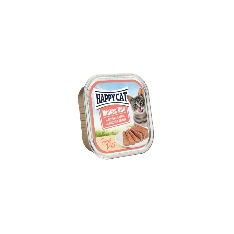 A zsenge baromfihúsból és zamatos lazacból készült Minkas Duo Baromfi és lazac változat kiváló minőségű nedves eledel macskáknak. A receptúra nem tartalmaz gabonaféléket vagy cukrot, és tartósítószerektől mentes.