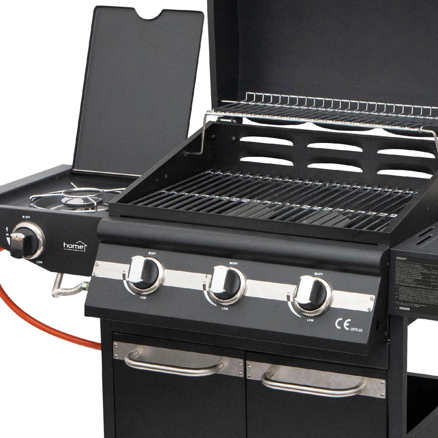 Hogyan varázsolható egy hétköznapi kerti sütögetés profi grillezési élménnyé? A Home GRG01 gázgrill ideális választás mindazoknak, akik megbízható, nagy teljesítményű és könnyen kezelhető kültéri grillezőt keresnek. A készülék három külön vezérelhető főégővel és egy praktikus oldalégővel rendelkezik, így egyszerre több fogás is elkészíthető – legyen szó húsokról, zöldségekről vagy akár szószokról. A letisztult design, a porszórt acél készülékház és a beépített hőmérő a stílusos és hatékony kerti sütés minden elvárásának megfelel. Teljesítményre tervezve A grill három darab főégővel van felszerelve, melyek egyenként 3,2 kW teljesítményt biztosítanak. A középső égő piezo gyújtással egyszerűen beindítható, megbízható működést garantálva minden alkalommal. A további kényelmet és sokoldalúságot növeli a 3,2 kW teljesítményű oldalsó gázégő, amely szintén piezo gyújtású – ideális kiegészítő szószok, köretek vagy előételek elkészítéséhez a főételek mellett. Praktikus és jól kialakított sütőtér A 530 x 400 mm méretű sütőfelület két krómozott acél sütőrácsból áll, melyek könnyen tisztán tarthatók és hosszú élettartamot biztosítanak. A beépített melegen tartó rács segít az ételek megfelelő hőmérsékleten tartásában, így minden fogás egyszerre tálalható. A grill porszórt borítása időjárásálló, tartós, és modern megjelenést kölcsönöz a készüléknek. Kényelmes és biztonságos használat A grill tartozékként egy nyomáscsökkentő készlettel érkezik, amely LPG gázkeverékhez, 30 mbar névleges nyomással lett tervezve. A W21,8x1/14” bal menetes gázpalackcsatlakozás ipari szabványnak megfelelő, biztonságos rögzítést kínál. A hőmérséklet-szabályozás egyszerű a fedélbe integrált hőmérő segítségével, míg a kihúzható, horganyzott zsírgyűjtő tálca tisztán tartja a belső részt, és megkönnyíti a karbantartást. Miért érdemes a Home GRG01 gázgrill mellett dönteni? - Három erős főégő és egy oldalsó égő – párhuzamos főzés, gyors elkészítés - Nagyméretű, krómozott sütőfelület – akár nagyobb társaság számára is - Hőmérő a fedélben és piezo gyújtás – pontos, biztonságos szabályozás - Tartozék nyomásszabályozó és tömlő – azonnal üzembe helyezhető - Strapabíró, időtálló kivitel – hosszú távú grillezési élmény Tegye emlékezetessé a nyári estéket és hétvégi kerti összejöveteleket! A Home GRG01 gázgrill megbízható teljesítményével és intelligens kialakításával tökéletes társ minden grillmester számára. Válassza ezt a stílusos és sokoldalú eszközt, és élvezze az igazi grillezési szabadságot minden évszakban!