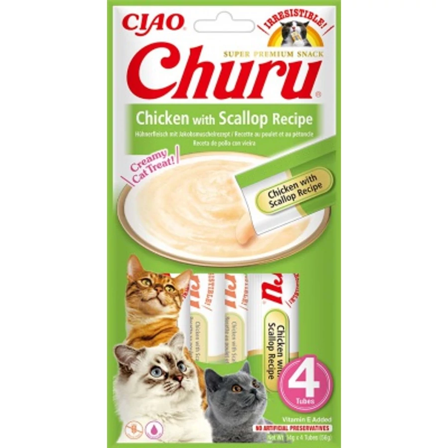 Ciao Churu – Csirkés fésűkagylós kiegészítő eledel macskáknak Krémes, csirkés, fésűkagylós macskacsemege.
