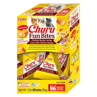 Mindent a Churu Fun Bites-ról: ・ 100 %-ban tiszta és természetes vadvízi tonhalból és tanyasi csirkéből készült ・ Nem tartalmaz gabonát, tartósítószert és mesterséges színezékeket ・ 2 textúra, zamatos íz, amit imádnak a macskák ・ Kiváló akár gyógyszer beadásához is ・ Magas nedvességtartalommal rendelkezik a macskák általános egészsége érdekében ・ Kézből etetésre kialakított, ezáltal segít elmélyíteni a kötődést ・ Innovatív és interaktív módja az idő együtt töltésének