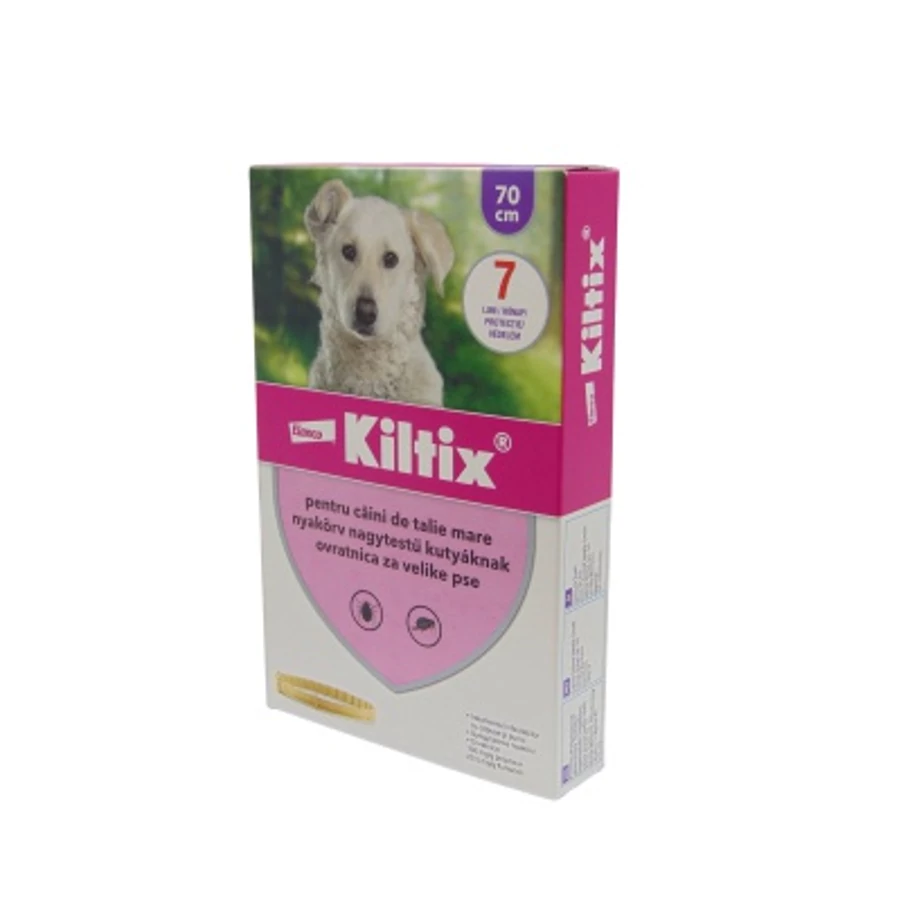 Hatóanyagok: - 38 cm-es: 12,5 g – Kiltix nyakörv kistestű kutyáknak A.U.V. - 53 cm-es: 30,2 g – Kiltix nyakörv közepes kutyáknak A.U.V. - 70 cm-es: 45,0 g – Kiltix nyakörv nagytestű kutyáknak A.U.V.