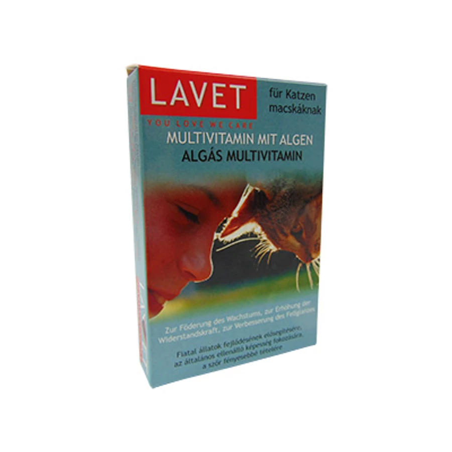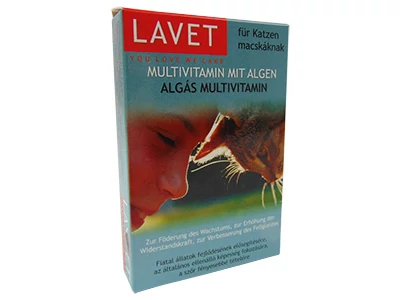 A LAVET algás multivitamin tabletták állatorvosok által fejlesztett, természetes eredetű, a szervezet számára nélkülözhetetlen anyagokat tartalmazó táplálék kiegészítık. A LAVET ALGÁS MULTIVITAMIN tabletta macskáknak a vonatkozó táplálkozás-élettani és gyógyszertani ismeretek alapján összeállított készítmény, amely a tej és a szárított élesztő magas biológiai értékű természetes alkotórészeit, valamint nagyszámú hozzáadott életfontosságú vitamint és mikroelemet biztosít kedvenceink optimális táplálásához. Az ízesített algás multivitamin életfontosságú vitaminjai, mikroelemei és a készítményben található nagy értékű alga- és élesztőfehérje elősegítik a fiatal állatok fejlıdését, fokozzák a betegségekkel szembeni ellenálló képességet, a vitalitást, valamint a szőr fényességét. A klorofillban gazdag természetes zöldalga egyúttal csökkenti a kellemetlen vizelet-, bőr- és szájszagot.