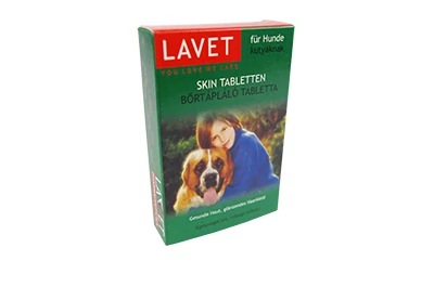 A LAVET bőrtápláló tabletták állatorvosok által kifejlesztett, természetes eredetű, a szervezet számára nélkülözhetetlen anyagokat tartalmazó táplálék kiegészítők. A LAVET bőrtápláló tabletta kutyának a vonatkozó táplálkozás-élettani és gyógyszertani ismeretek alapján összeállított készítmény, amely a bőr normál anyagcsere-folyamataihoz és az egészséges, fényes szőrzet kialakulásához és fenntartásához nélkülözhetetlen magas biológiai értékű fehérjéket, nagyszámú vitamint, makro- és mikroelemet, valamint aminosavat biztosít kedvenceink optimális táplálásához. Ennek alapján felhasználásának javallatai a bőr általános ellenálló képességének fokozása, korpázásának és gyulladásos bántalmainak megelőzése, betegségek utáni regenerálódásának elősegítése, továbbá a szőrzet fénytelenné, durvává válásának, kihullásának megelőzése és a fényes, csillogó szőrzet kialakítása és fenntartása.