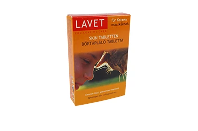 A LAVET bőrtápláló tabletták állatorvosok által kifejlesztett, természetes eredetű, a szervezet számára nélkülözhetetlen anyagokat tartalmazó táplálék kiegészítık. A LAVET BİRTÁPLÁLÓ tabletta macskáknak a táplálkozás-élettani és gyógyszertani ismeretek alapján összeállított készítmény, amely a bőr normál anyagcsere-folyamataihoz és az egészséges, fényes szőrzet kialakulásához és fenntartásához nélkülözhetetlen magas biológiai értékű fehérjéket, nagyszámú vitamint, makro- és mikroelemet, valamint aminosavat biztosít kedvenceink optimális táplálásához.Ennek alapján felhasználásának javallatai a bőr általános ellenálló képességének fokozása, korpázásának és gyulladásos bántalmainak megelőzése, betegségek utáni regenerálódásának elősegítése, továbbá a szőrzet fénytelenné, durvává válásának, kihullásának megelőzése és a fényes, csillogó szőrzet kialakítása és fenntartása.