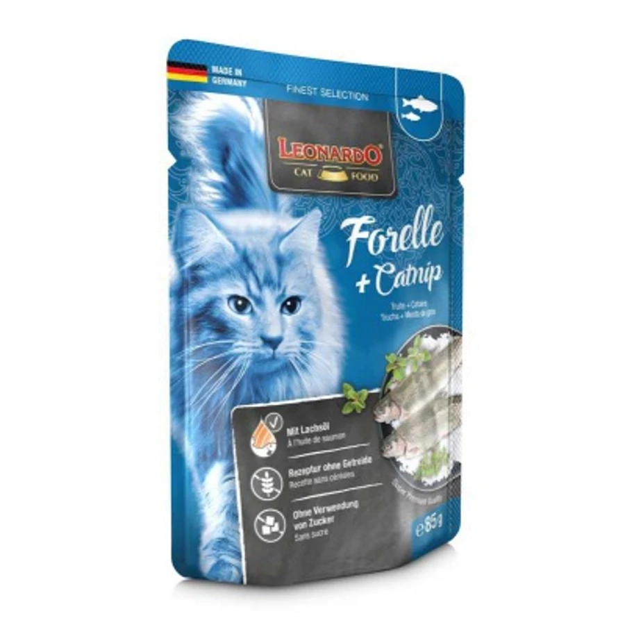 Pisztráng (30 %); Csirkeszív, -máj (30 %); Pisztráng-, csirke-, marhahúslé (28,7 %); Marhatüdő (10 %); ásványi anyagok (1 %); lazacolaj (0,2 %); Macskagyökér (0,1 %)