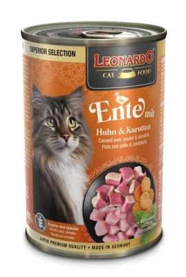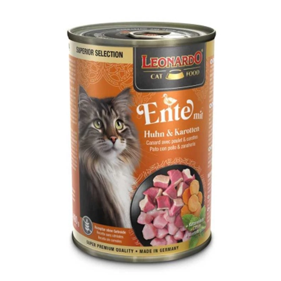 Bevezetés a kacsával: A finom kacsahús a legfinomabb élvezet a kis ínyencek számára. Ízletesen kiegészítve finom csirkehússal és belsőségekkel, ez a fajta kifinomult változatosságot hoz az etetőtálba – intenzíven szaftos harapással köszönhetően a csirke és kacsa húslevesének. Különleges élmény az ízlelőbimbóknak és a szemnek: A hozzáadott lazacolaj többszörösen telítetlen zsírsavaival selymes, puha szőrzetet biztosít.