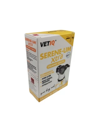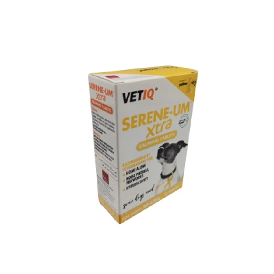 A Serene–UM Xtra tabletta természetes összetevőket tartalmazó kiegészítő takarmány kutyák számára viselkedési problémák, hiperaktivitás, nyugtalanság, szorongás, továbbá tűzijátéktól és mennydörgéstől való félelem, utazási problémák és túlzott ugatás esetén.