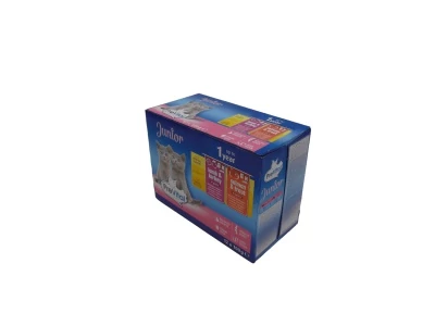 - lazaccal és pisztránggal szószban: hús és állati származékok, hal és halszármazékok (4% lazac, 4% pisztráng), növényi eredetű származékok, ásványi anyagok.