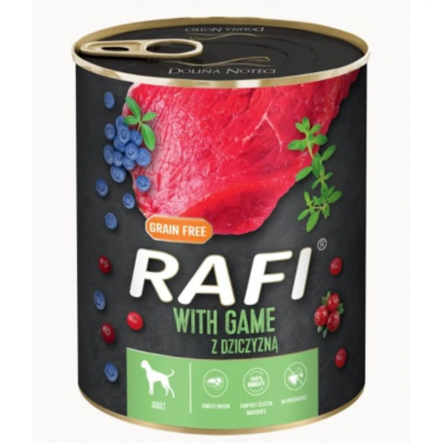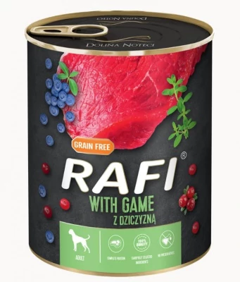 A Rafi teljes értékű nedves táp vadhússal biztosítja a csontok és fogak megfelelő mineralizációját és az összes anyagcsere-folyamat megfelelő lefolyását a felnőtt kutyák minden fajtája számára. A könnyen emészthető és teljes értékű fehérje és zsír kiegyensúlyozott forrása. Minden szükséges ásványi anyagot és vitamint tartalmaz a napi szükségletet fedező mennyiségben. A vörösáfonya és áfonya hozzáadása számos értékes biológiailag aktív vegyülettel gazdagítja a kutya étrendjét.