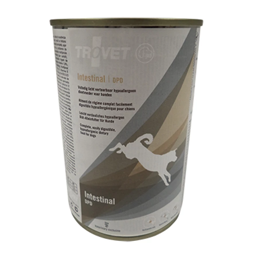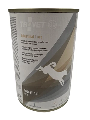 A TROVET INTESTINAL teljes értékű táp főként az érzékeny emésztőrendszerrel rendelkező kutyák számára. Fehérjeforrásként kacsahúst tartalmaz, szénhidrátforrásként pedig kizárólag burgonyát, mivel ezek a legritkább esetben váltanak ki túlérzékenységi reakciót. A megemelt rosttartalom mellett fokozott figyelmet fordítottak a könnyű emészthetőségre. Válogatós, vagy étvágytalan kutyák is szívesen fogyasztják mivel rendkívül ízletes. Javasolt minden olyan esetben, amikor könnyen emészthető magas biológiai értékű, az emésztőrendszert kímélő tápra van szükség. Laktóz, szója és buzaglutén mentes, táplálék intolerancia esetén különösen ajánlott.